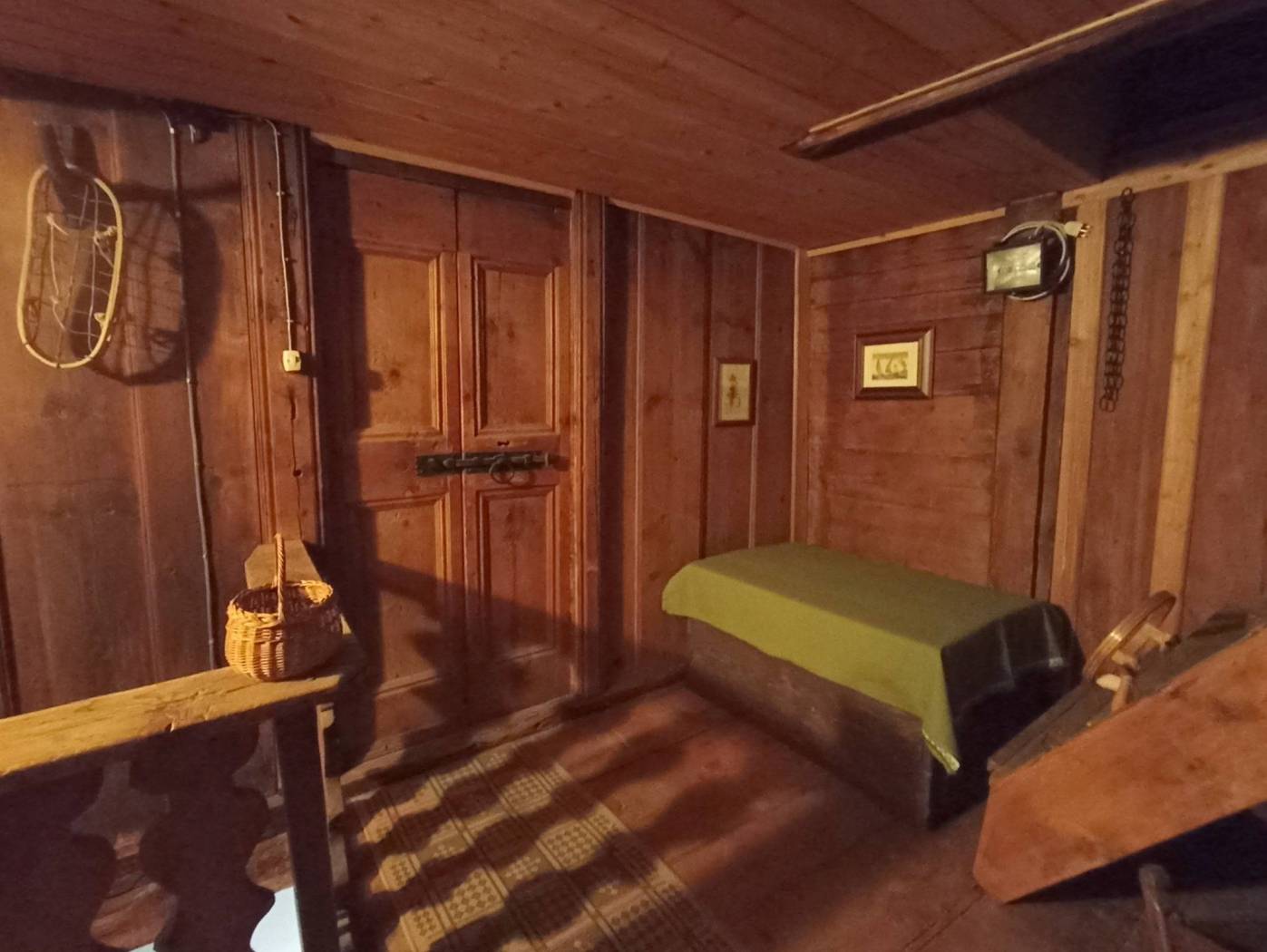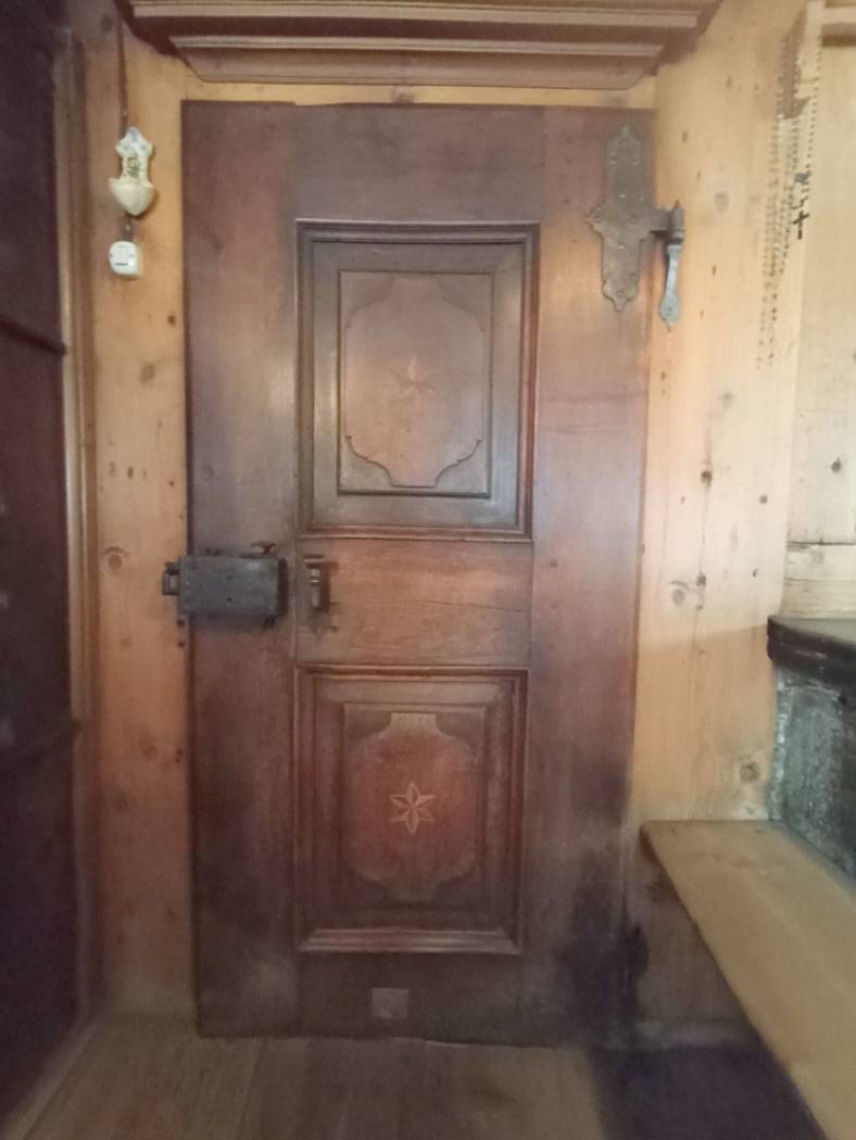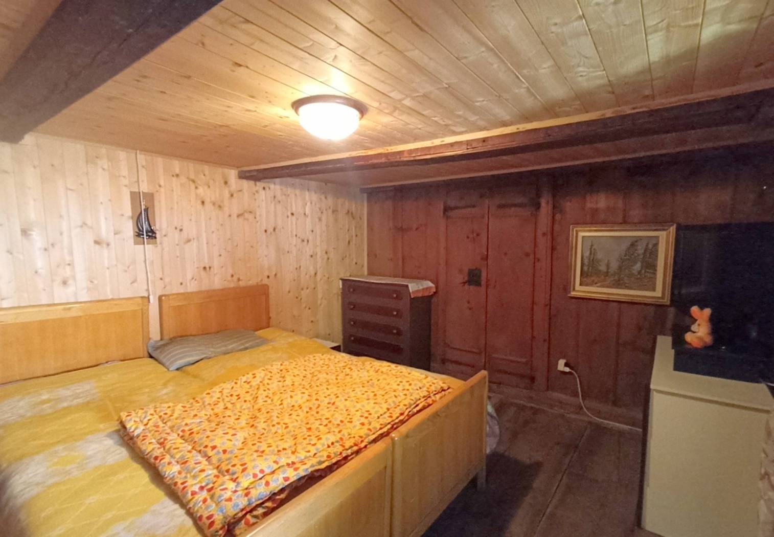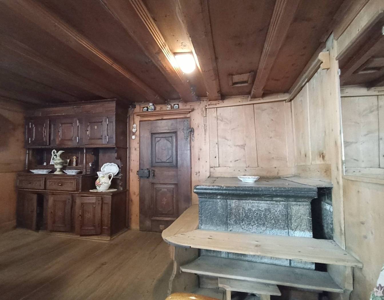 Al piano terra, dietro un massiccio portone, troviamo un'ampia cantina. Al primo piano raggiungibile con l'aggiunta "moderna" di una scala coperta, troviamo un disimpegno, la cucina ed il nucleo centrale della casa : la "stube" , tradizionalmente unico locale riscaldato, con pareti rivestite da pannelli di legno e fornetto (stufa in pietra ollare), cuore della vita quotidiana nei lunghi mesi invernali. Al secondo piano attraverso un delizioso disimpegno raggiungiamo le due grandi camere da letto (tutto rigorosamente originale) , il bagno e , con una breve rampa di scale un ampio locale nel sottotetto. il riscaldamento è fornito da stufe a legna e fornetto della stube. La proprietà comprende una casetta, anch'essa in legno , con basamento e tetto in sasso, a pochi metri dalla casa ed adibita a legnaia/magazzino